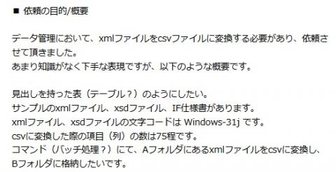 この記事を書くためにランサーズを眺めていると5000円から1万円でXMLをCSVに変換するプログラムをやってほしいというものがありました。これはうまくいけば、2時間ぐらいでできそうな案件です。しかし、データーがどのようなものかも不明で、うまくいかなければ、1日がかりの作業になるかのうせいもあります。そして、提出したものが不満だと言われて踏み倒される可能性も出てきます。