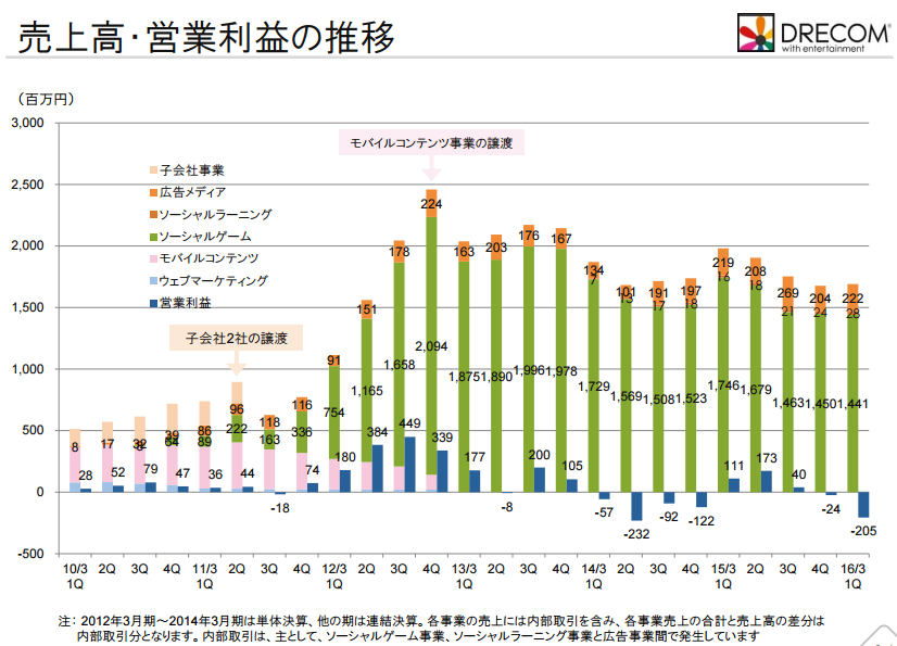 ドリコムは、2014年に3億円の赤字を出して以降、不安定な状況が続いています。2016年5月に発表した16年3月期の連結最終損益は5億3700万円の赤字(前の期は1700万円の黒字)に転落しています。