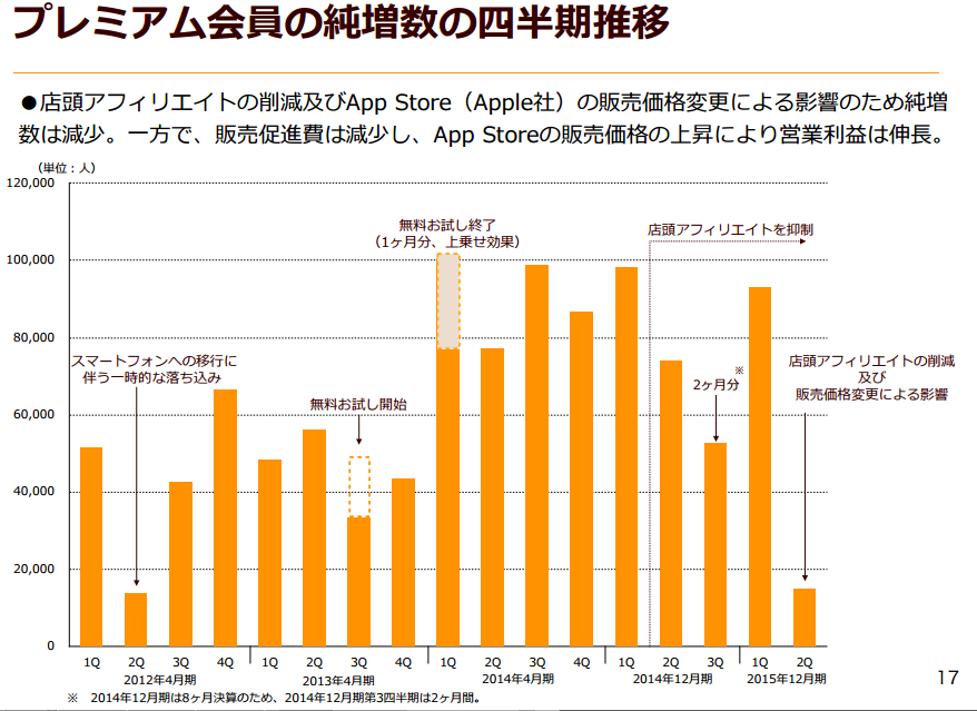 無料で閲覧が可能なものに対して、月額400円を支払う『プレミアムユーザー』を獲得するのは大変です。そこで、NTTドコモと協力して、店頭アフィリエイトを行って会員数を伸ばしますが、この会員の半数以上が脱退するので、店頭アフィリエイトを止めた時に有料会員数が減少していきます。それでも、店頭アフィリエイトによって認知度を上げるという事に貢献しているので、マーケティングのお金の使い方としては悪くないかもしれません。
