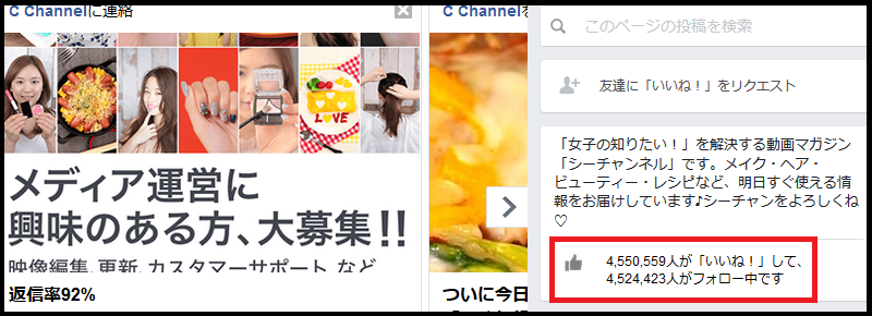 特にC ChannelのFacebookページが非常に強くて、C ChannelはFacebookで450万いいね!数を獲得しています。これだけの数のいいね!を獲得するのは、簡単な事ではなくて、ブランド力を付ける事ができた事になります。ちなみに、あのユニクロのFacebookですら100万いいね!なので、いかにC Channelのブランディングが上手であるか分かります。獲得する再生数は、1動画当たり10万回を超えてきます。これは、1分で共有されやすく絞っている事と、ガールズ系の動画がFacebookにない(儲からないので誰もアップロードしたがらない)という事があるでしょう。