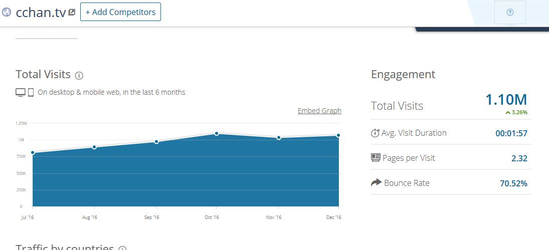 かなり多くのユーザーを抱えているという事でしたが、肝心のPV数はあまり伸びているようには思えません。Similar webで確認すると、110万PVという事で悪い数字ではないにしても、ビジネスの規模としては小規模になります。ほとんどスマートフォンからのアクセスになるので、スマートフォンがメインになっているので、パソコンは参考程度にしかなりませんが、それでもウェブサイトとしての規模は日本で4000位という段階です。