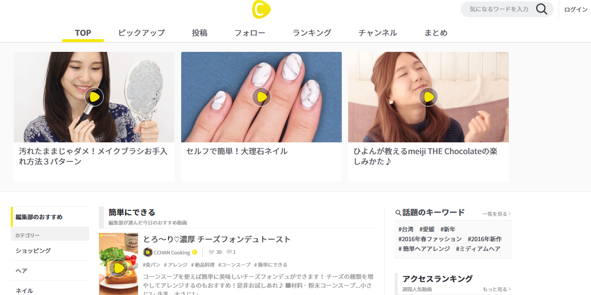 LINEを退社して創業した森川さんが手掛けるC Channnelの狙いどころは、インターネット上の女子を動画で取り込むという方法。今後は、スマートフォンによる動画視聴がメインになるだろうという考え方は、アベマTVと同じで、アベマTVが総合的なTVを目指しているのに対して、C Channelが目指すのは、女性が気軽に利用できる動画サイト。
