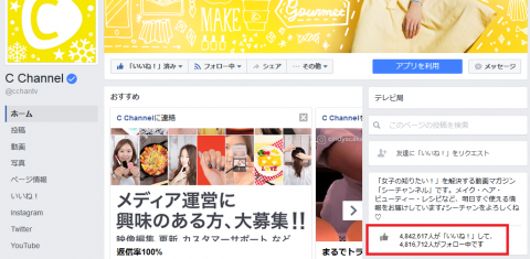 Facebookのいいね!を伸ばす為に多くの会社が金を払ったりして、いいね!を1いいね!100円で購入する訳ですけど、C Channelを見ていると、そんなことをしなくても動画を大量に配信するだけ(正確に言えば、動画を大量配信した上で、自社のホームページ上でいいね!を促す)で、Facebookのいいね!を伸ばせるよねという話に気が付いてきました。C Channelは、Facebookページに500万いいね!を持っている訳ですけど、それは1いいね!100円だとすると、5億円あれば買えるものです。