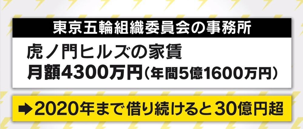東京オリンピックの五輪組織員会が使っている事務所が新しい虎ノ門ヒルズにあって、家賃が月額4300万円です。これから税金が投入されると言われている東京五輪の事務所としては全くふさわしくない事務所であるにも関わらず、東京五輪の組織委員会はこの事務所から動こうとしません。まるで、管理者である森ビルにお金を渡す為にこの事務所にしているかのようです。